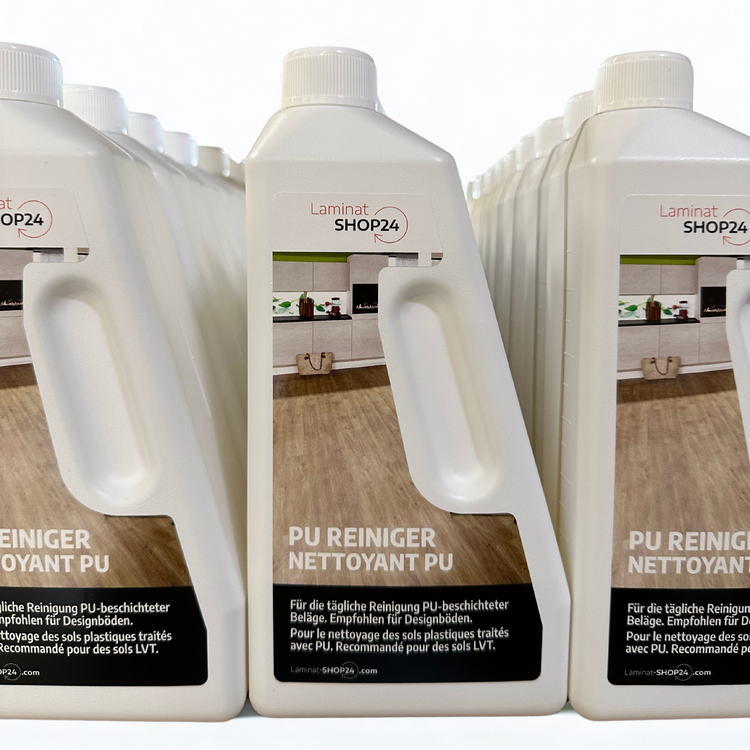 PU Reiniger im Verhältnis 1:200 (50 ml auf 10 Liter Wasser) verdünnen und den Boden mit dieser Lösung wischen.